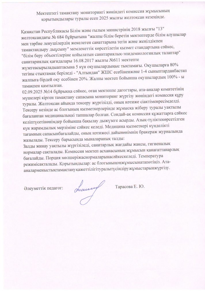 2025 жылдың желтоқсан айындағы кезеңдегі мектептегі тамақтану мониторингі жөніндегі комиссия жұмысының қорытындылары туралы есеп