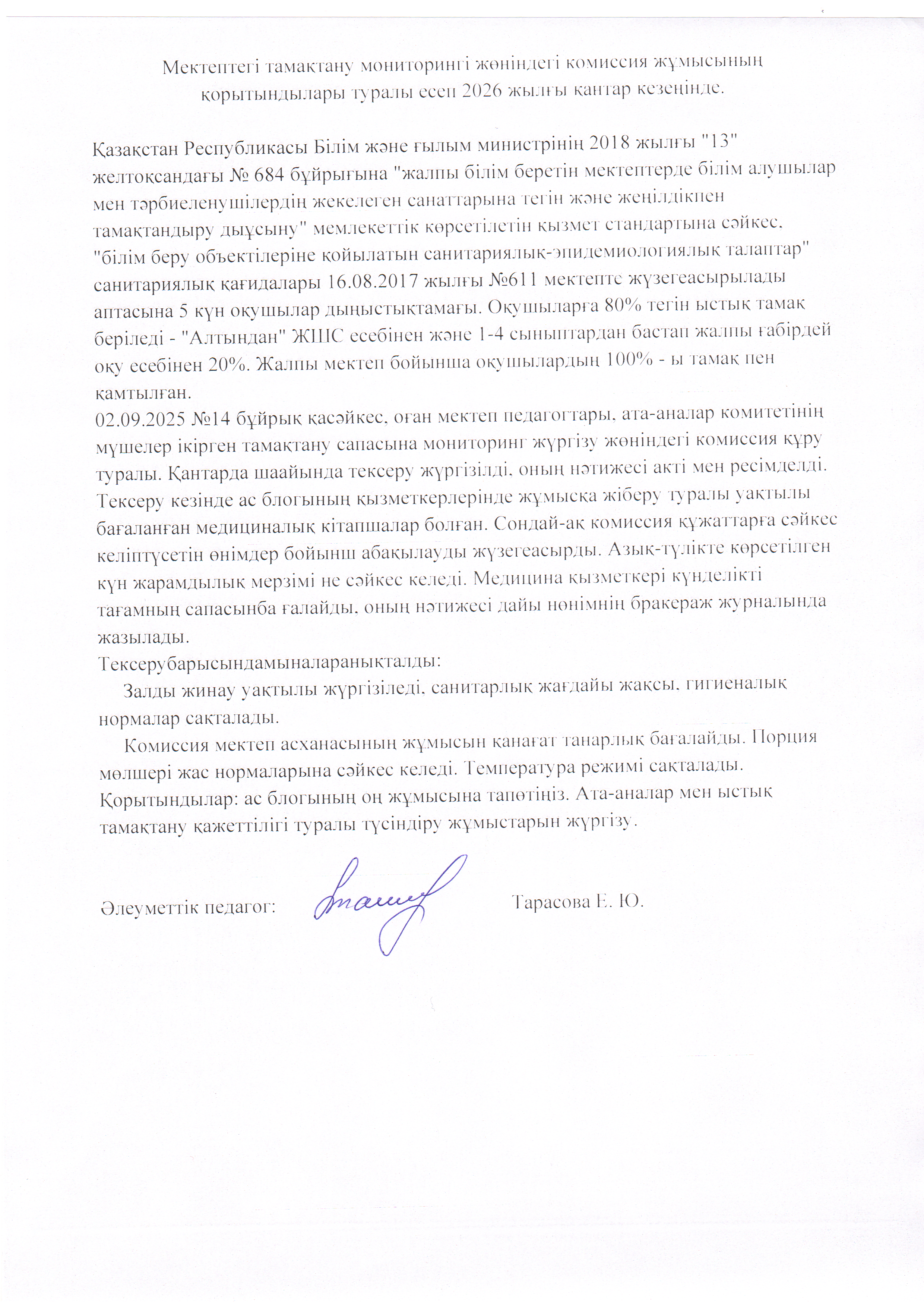Мектептегі тамақтануды бақылау комиссиясының 2026 жылғы қаңтар айындағы жұмысының нәтижелері туралы есеп