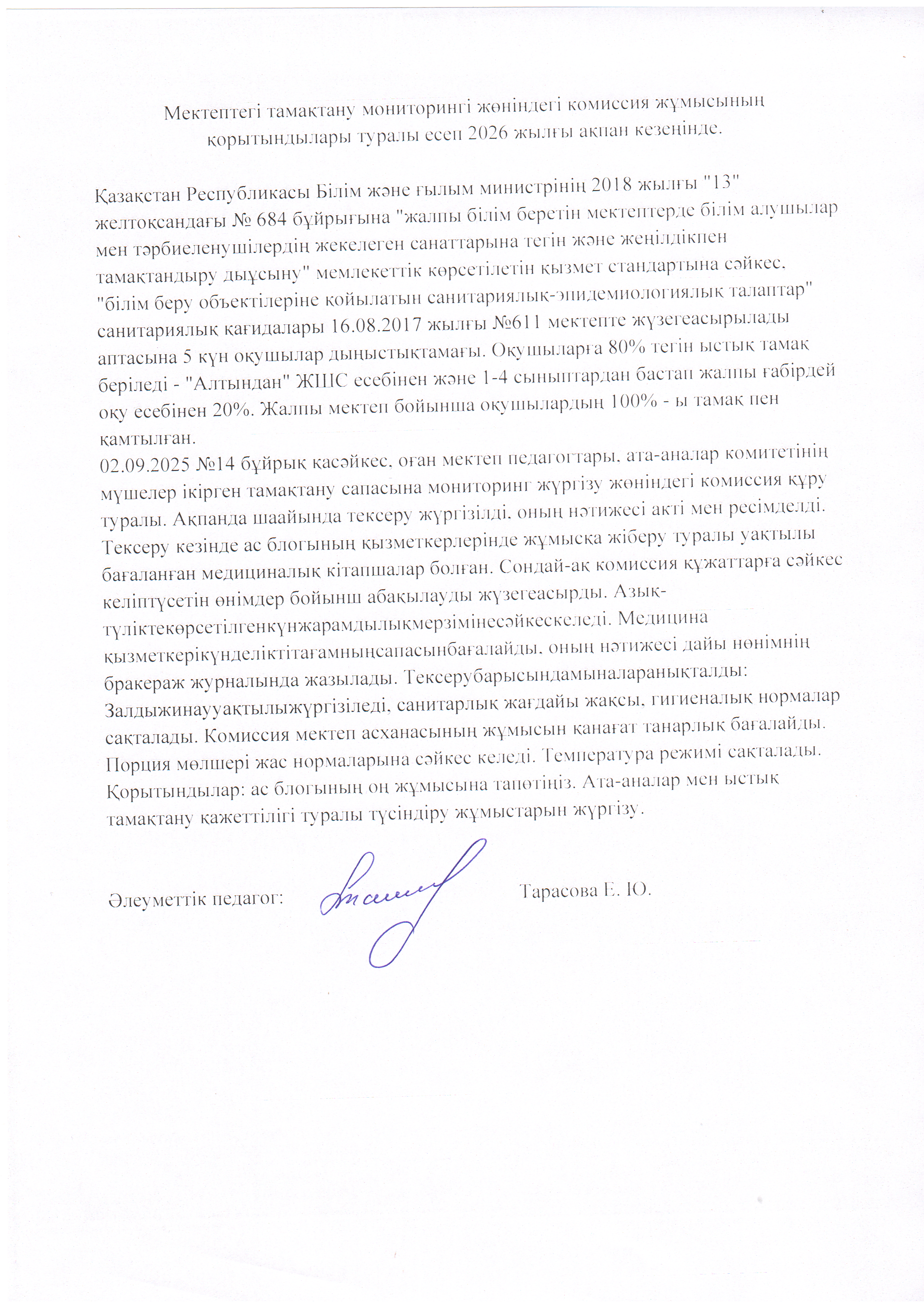 Мектептегі тамақтануды бақылау комиссиясының 2026 жылғы ақпан айындағы жұмысының нәтижелері туралы есеп